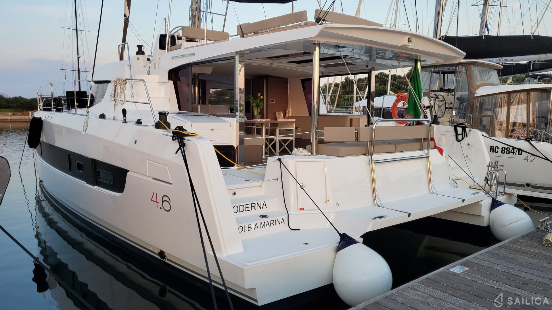 Catamaran Bali 4.6 Moderna- A/C, Generator, WM, Solar Panel, BBQ is docked in the beautiful Cannigione Marina, and it is important to know that all rented vessels must be returned to the same location from which they were rented.