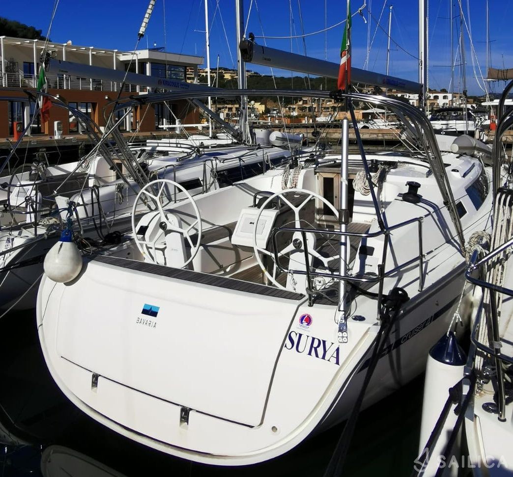 Bavaria 41 Cruiser Surya is a beautiful Sailing yacht built in 2019. This Sailing yacht is operated by the Kiriacoulis charter company and docked at Marina di Portisco.