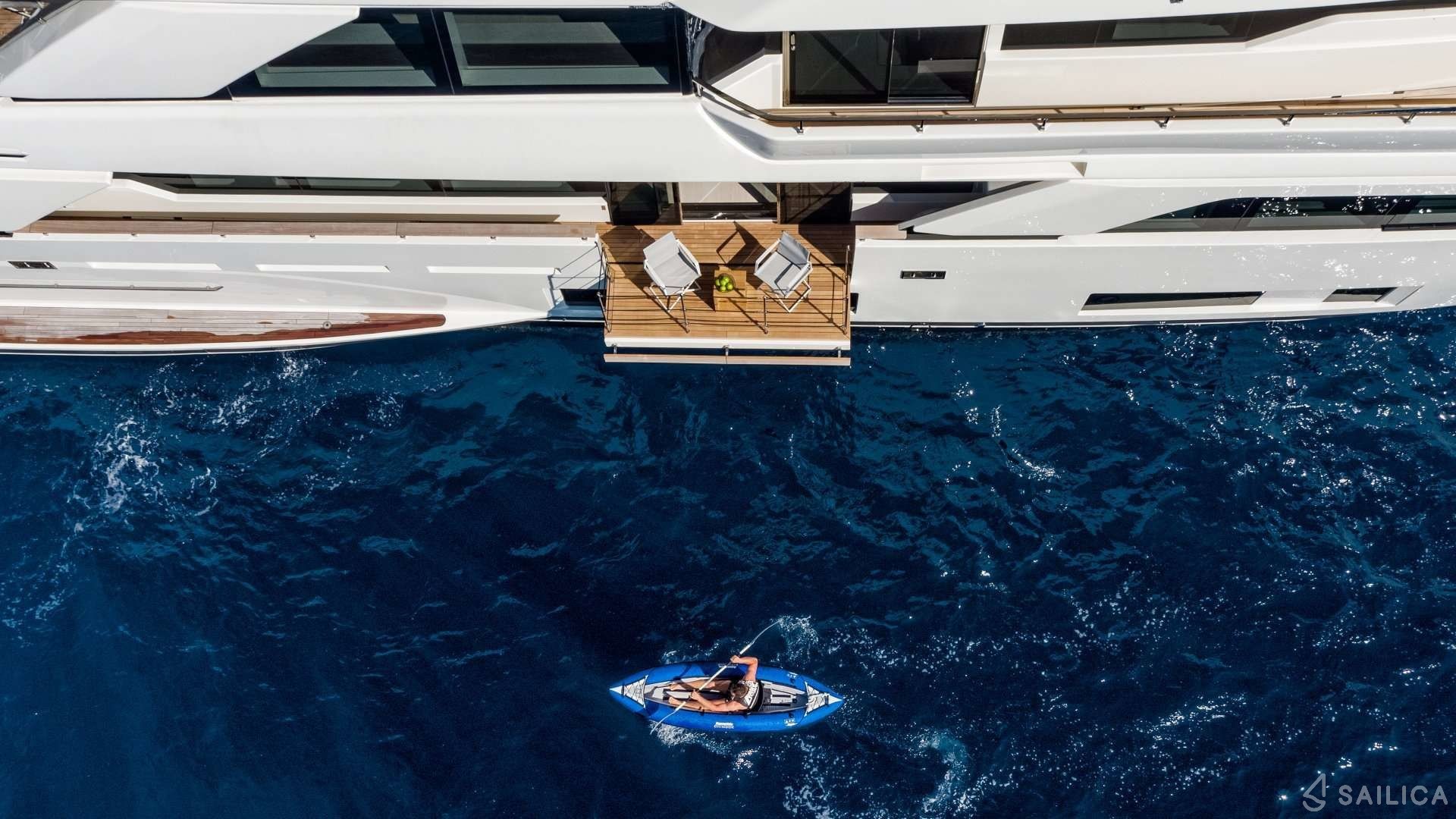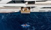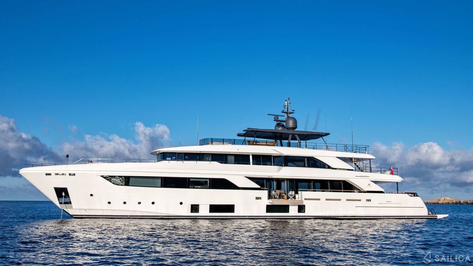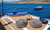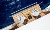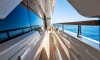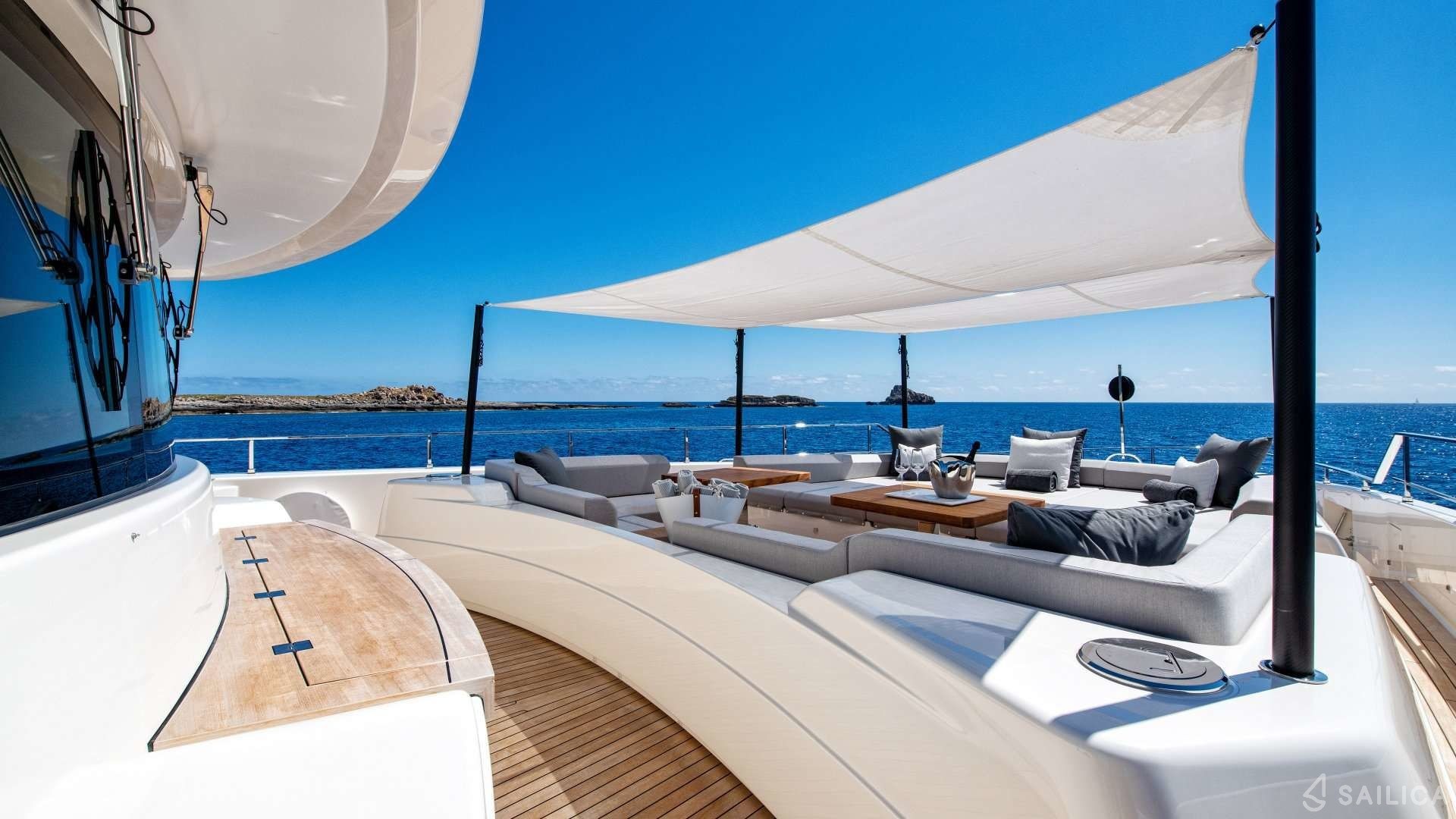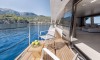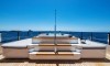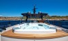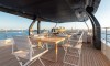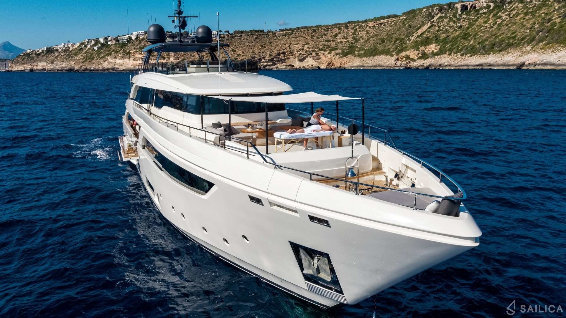 Ferretti Custom Line Navetta Sangha has 5 cabins and can comfortably accommodate 10 people. It is conveniently equipped with 5 toilet (latrine),a Bathing platform, Sink, Teak deck, Radar , and Dishwasher.