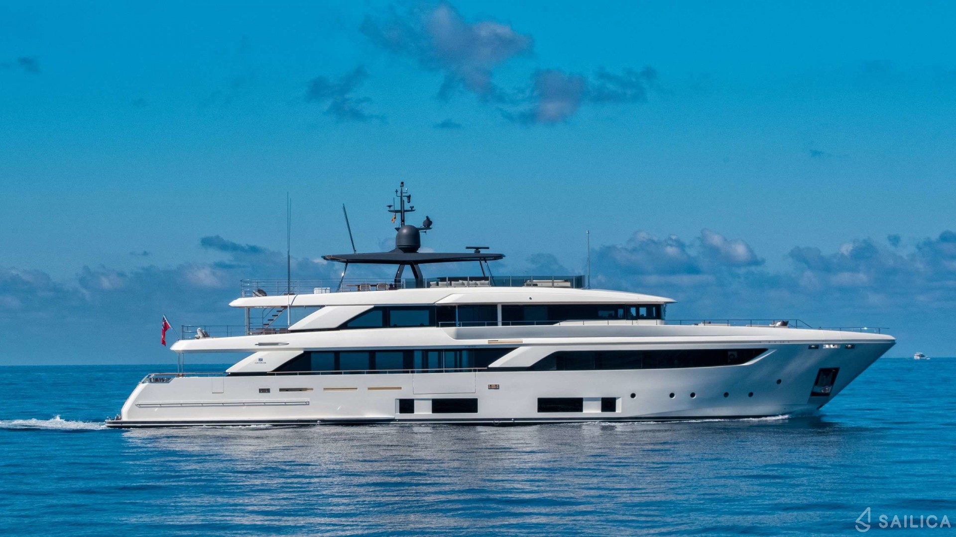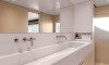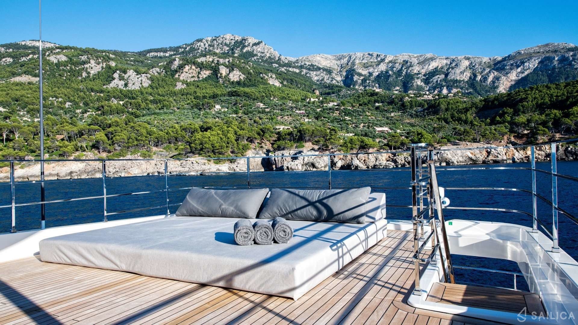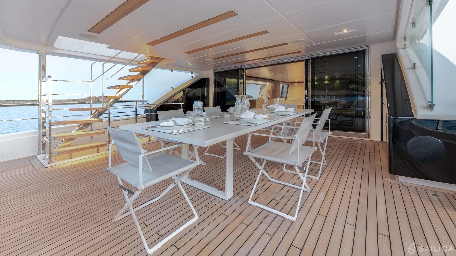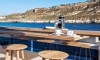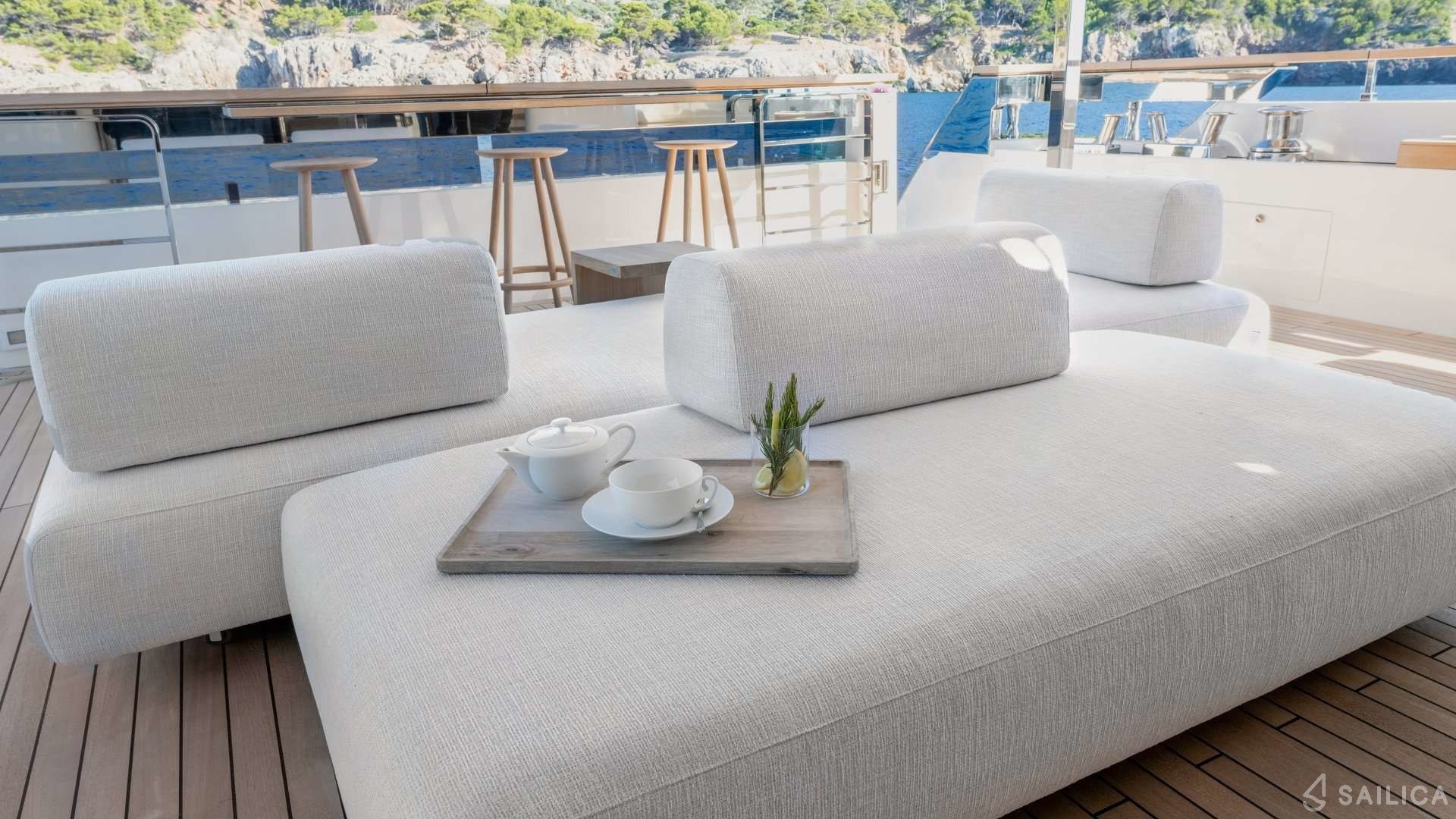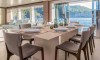 Ferretti Custom Line Navetta Sangha has 5 cabins and can comfortably accommodate 10 people. It is conveniently equipped with 5 toilet (latrine),a Bathing platform, Sink, Teak deck, Radar , and Dishwasher.