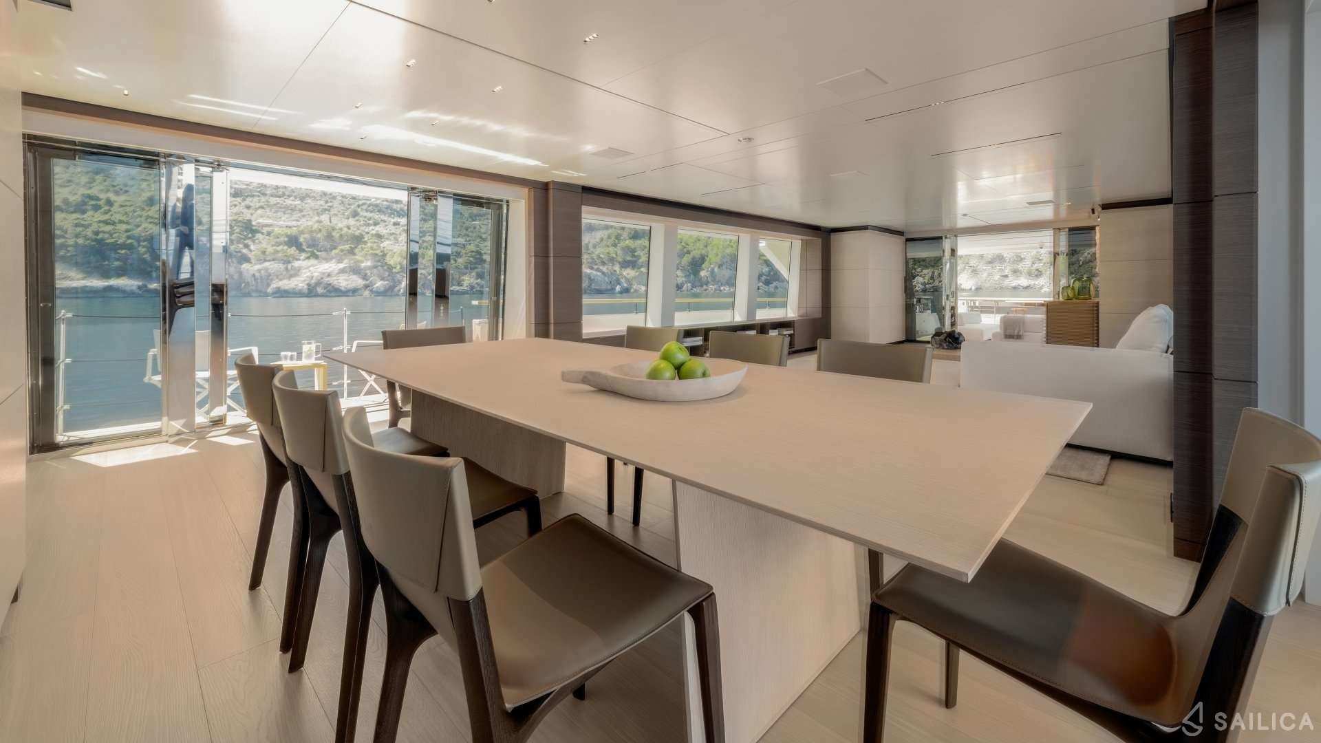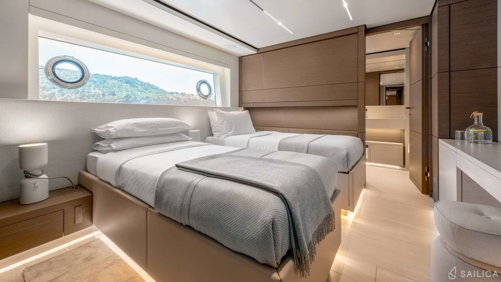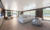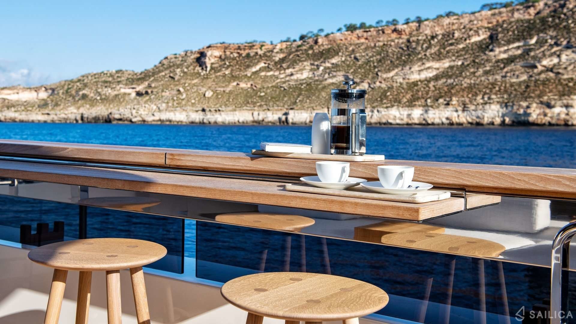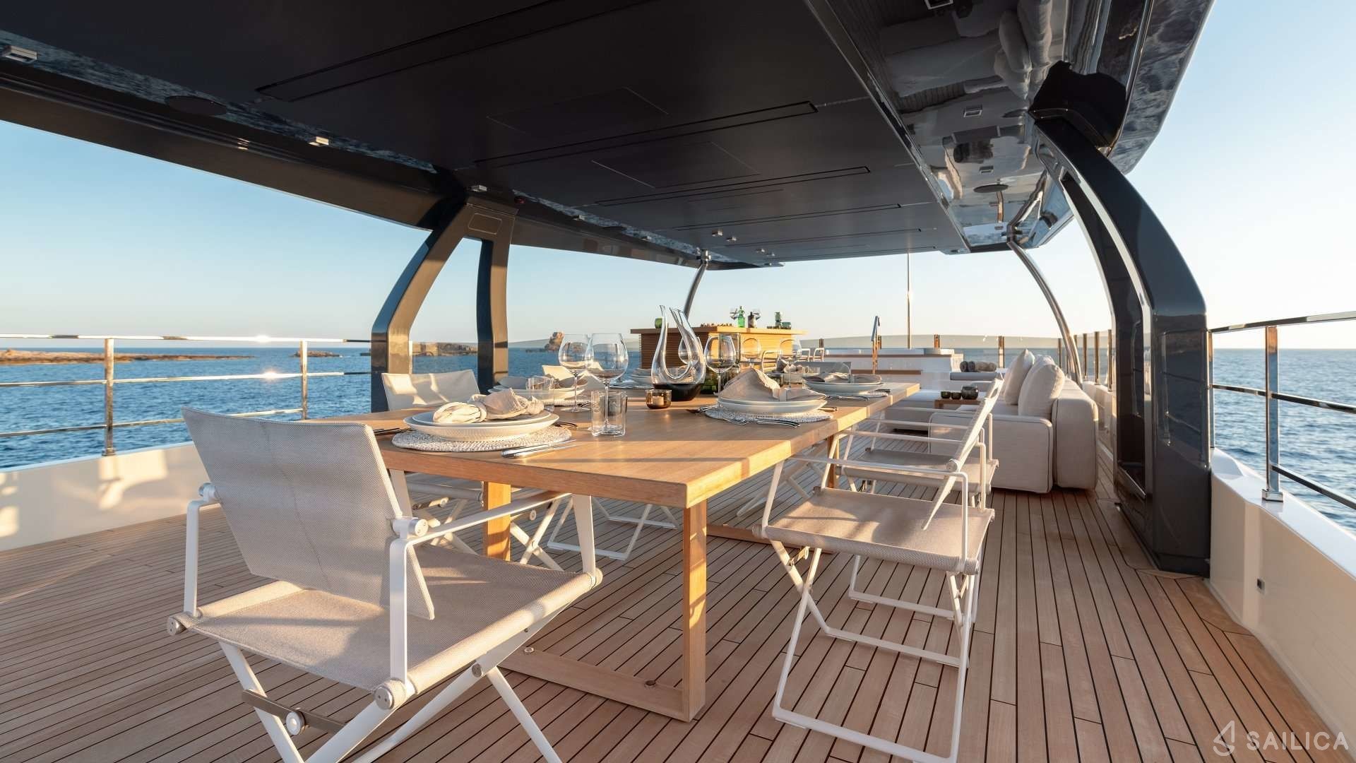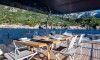 Ferretti Custom Line Navetta Sangha has 5 cabins and can comfortably accommodate 10 people. It is conveniently equipped with 5 toilet (latrine),a Bathing platform, Sink, Teak deck, Radar , and Dishwasher.