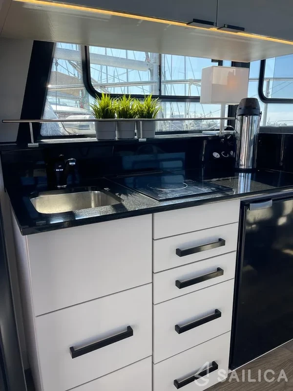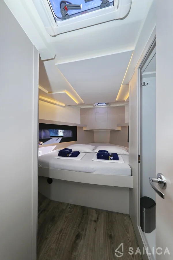 Futura 40 Grand Horizon Muneca has 3 cabins and can comfortably accommodate 6 people. It is conveniently equipped with 3 toilet (latrine),a Bathing platform, Sink, Hot Water , First aid kit, and Life jackets.