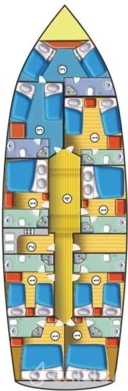This yacht can comfortably accommodate up to 12 guests, it contains 6 cabins, and 7 WC (toilet).