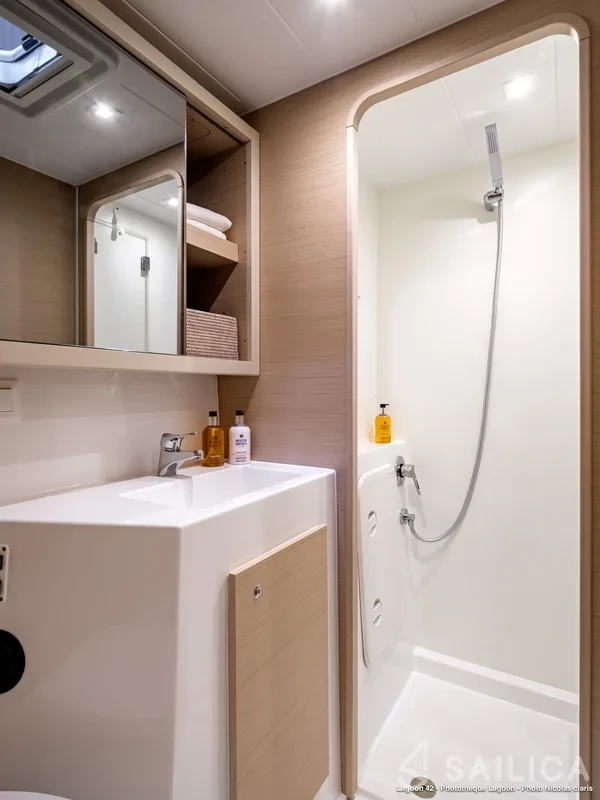 Lagoon 42 SAX IV Catamaran was produced in 2025, and is operated by the Nautika Centar Nava charter company. This luxurious vessel can comfortably accommodate up to 8 people, it contains 4 cabins and 4 WC. For your convenience, Lagoon 42 SAX IV is equipped with an GPS Chartplotter, Electric WC, Dinghy with outboard engine, WIFI, Gas stove and oven and much more.