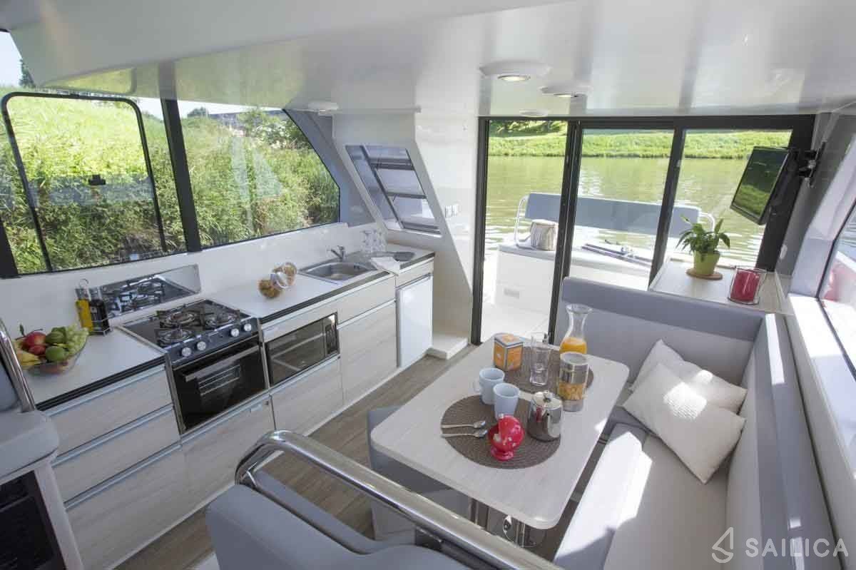 Le Boat Horizon 1 PF Wolfsbruch 2 is a beautiful houseboat built in 2018. This houseboat is operated by the LeBoat charter company and docked at Marina Wolfsbruch.