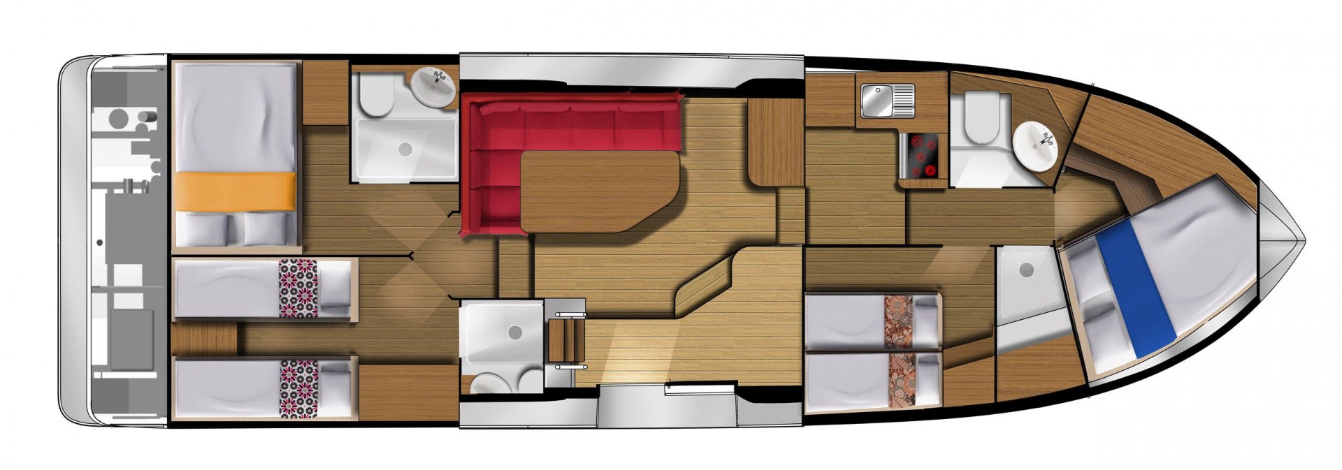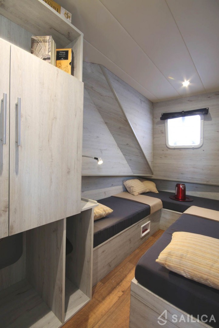 Minuetto Electric 8+ 10 has 4 cabins and can comfortably accommodate 8 people. It is conveniently equipped with 3 toilet (latrine),a Sink, Microwave, Dishwasher, Oven, and Pillows and blankets.