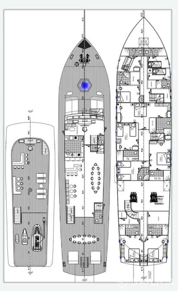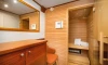 This yacht can comfortably accommodate up to 12 guests, it contains 6 cabins, and 6 WC (toilet).