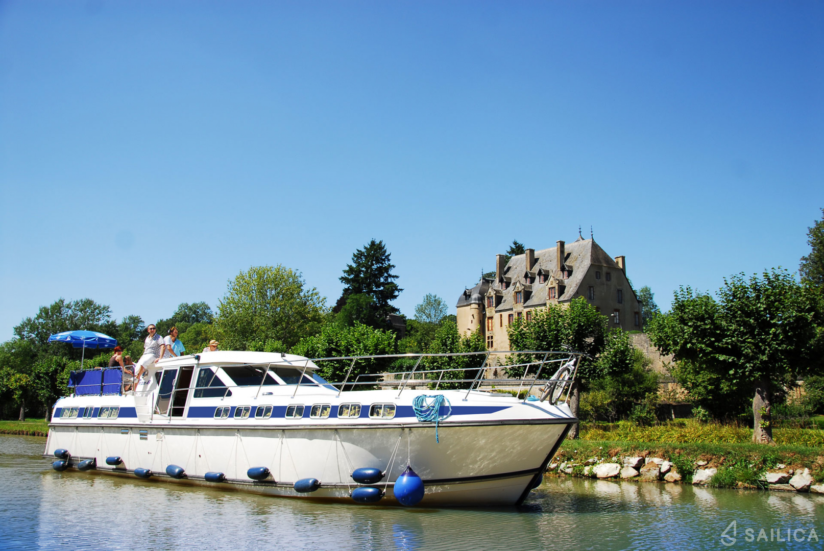 Nicols Sedan 1170 is a beautiful houseboat built in 1998. This houseboat is operated by the Les Canalous charter company and docked at Marina Pont a Bar.