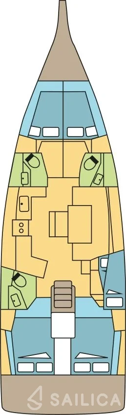 This yacht can comfortably accommodate up to 10 guests, it contains 5 cabins, and 3 WC (toilet).