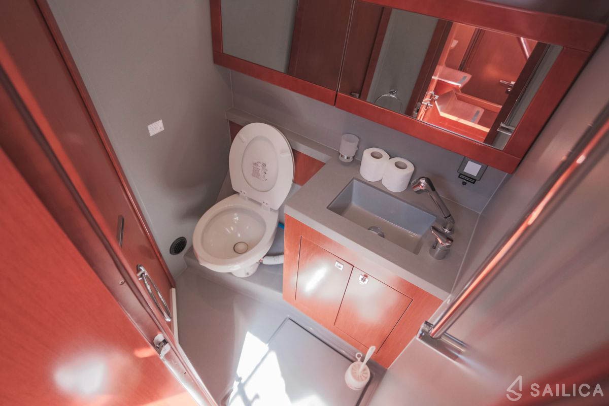 This yacht can comfortably accommodate up to 10 guests, it contains 5 cabins, and 3 WC (toilet).