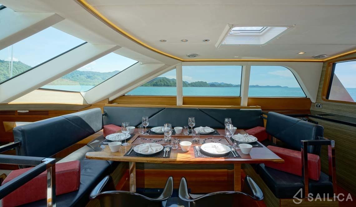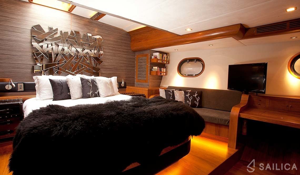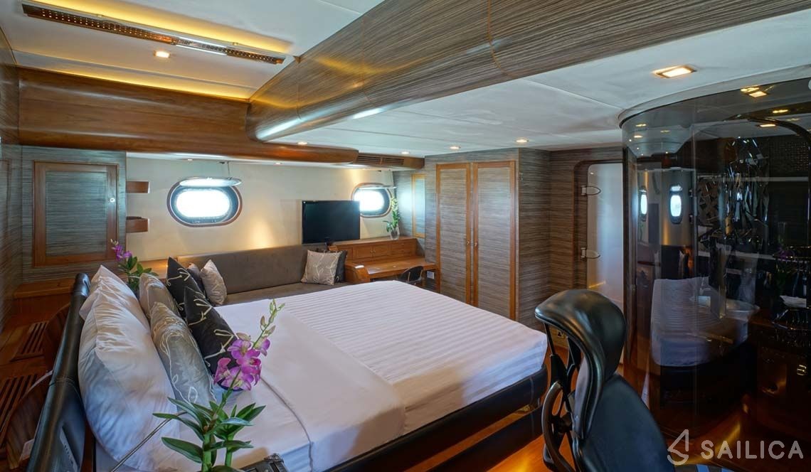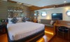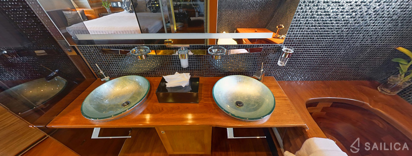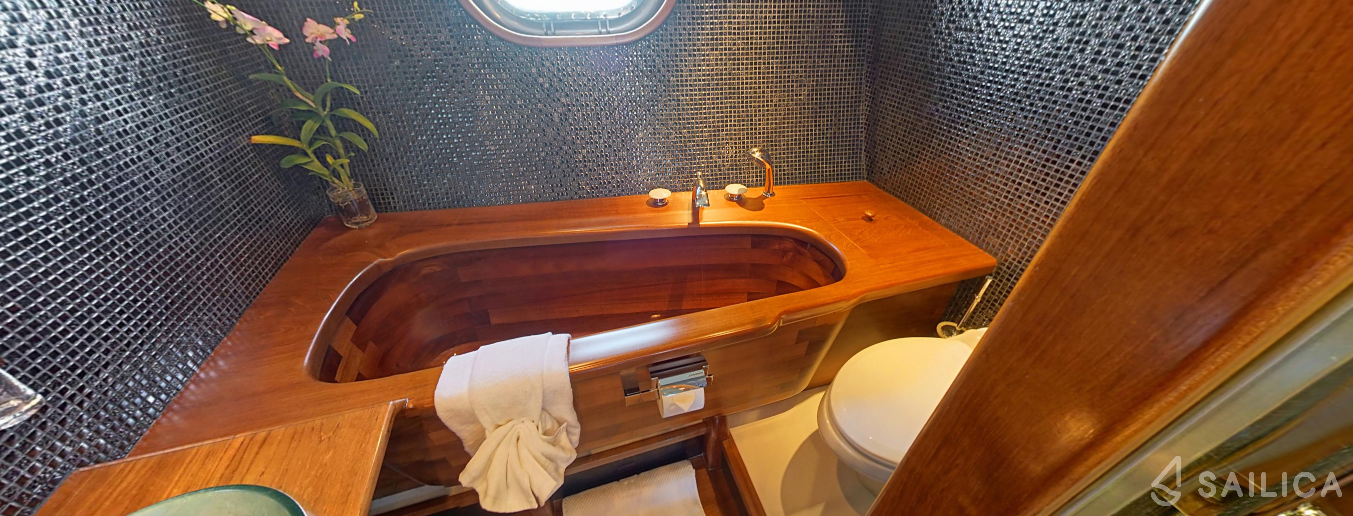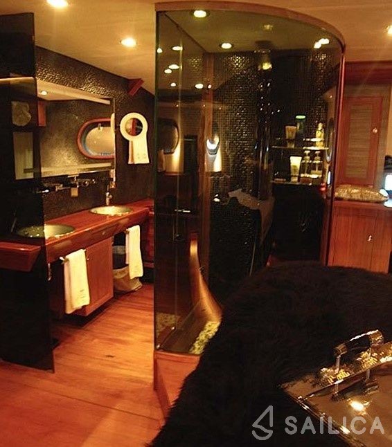 This yacht can comfortably accommodate up to 14 guests, it contains 7 cabins, and 6 WC (toilet).