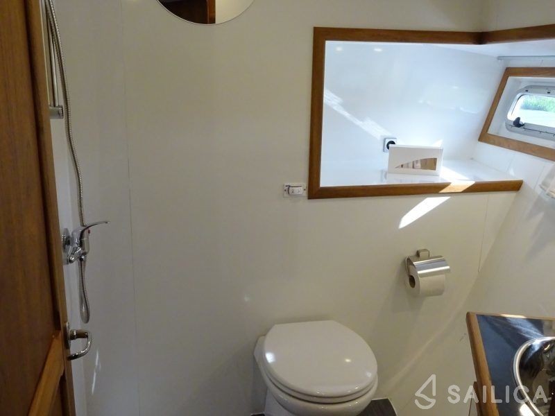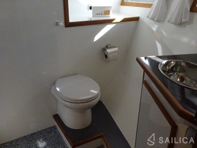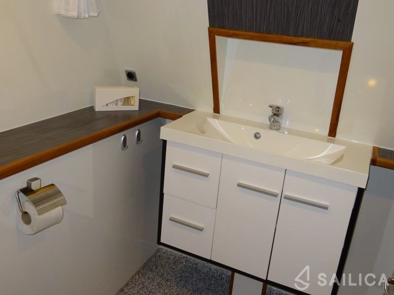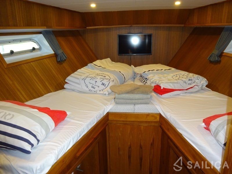 Topline 1500 Viatrix Elite has 3 cabins and can comfortably accommodate 6 people. It is conveniently equipped with 3 toilet (latrine),a Bathing platform, Sink, Oven, Towels, and Coffee machine.