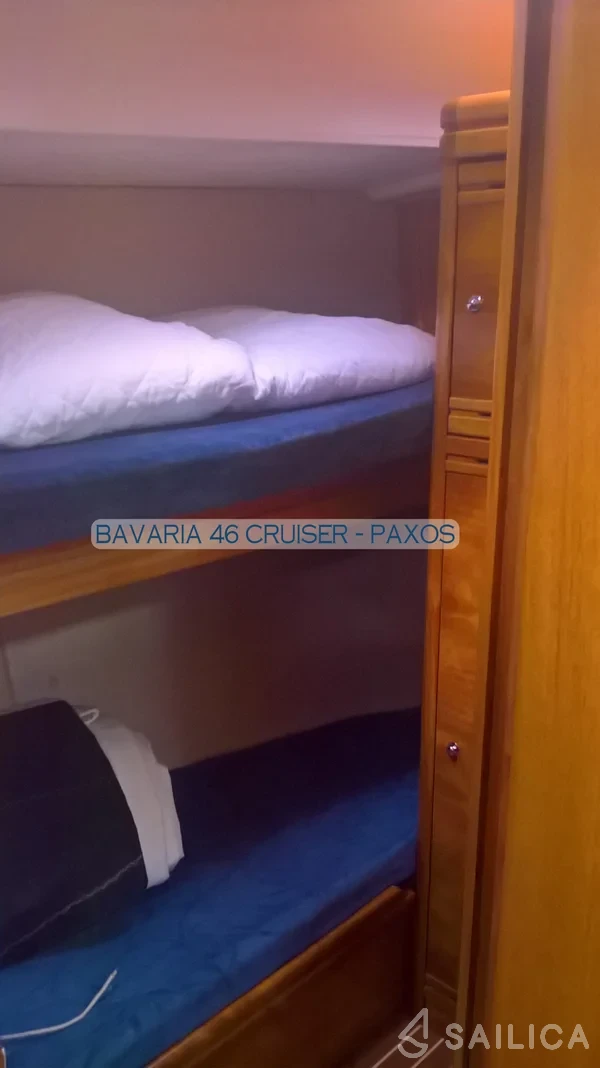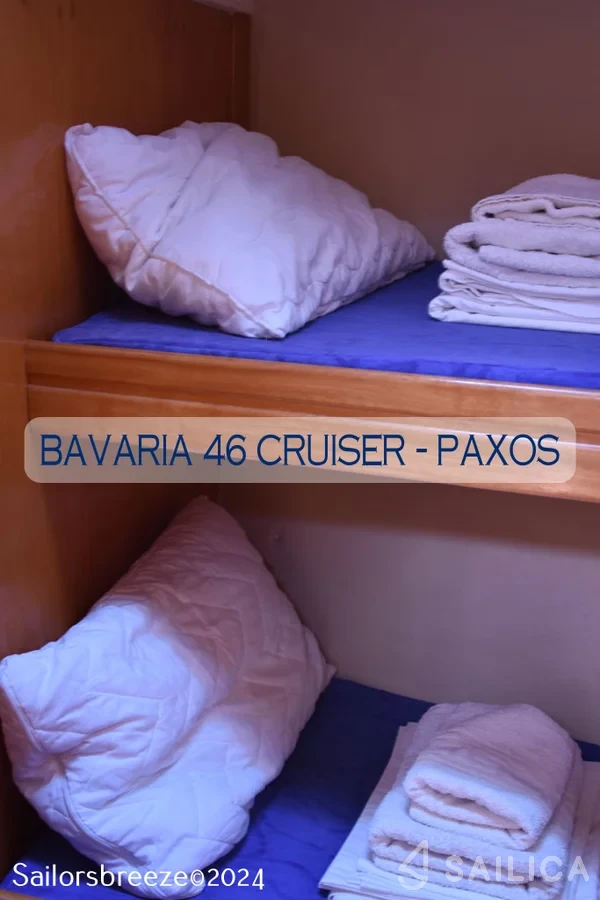 Bavaria 46 Cruiser Paxos — парусная яхта, которая была построена в 2007 году и принадлежит чартерной компании Sailorsbreeze. Количество человек, на которые рассчитана яхта — 8, количество кают — 4, гальюнов (туалетов) — 2. После аренды Bavaria 46 Cruiser, вам необходимо прибыть на место check-in — D-Марина Гувия, Греция.
