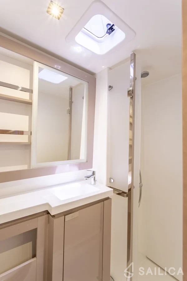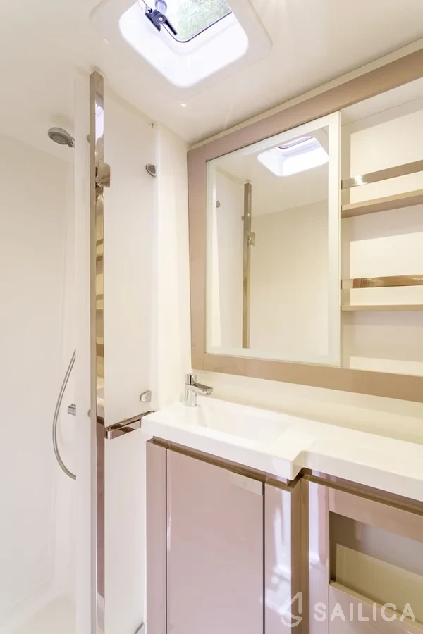 На Elba 45 Gelos есть все условия для комфортного отдыха: 4 гальюна, Лейзи бег, Приборы, Микроволновая печь, Горячая вода, Анемоментр/Ворона.