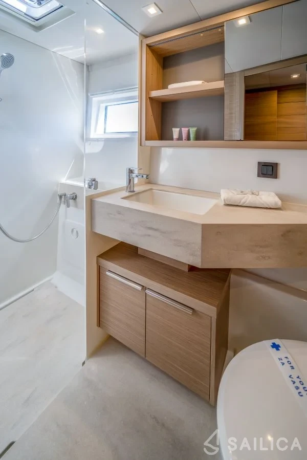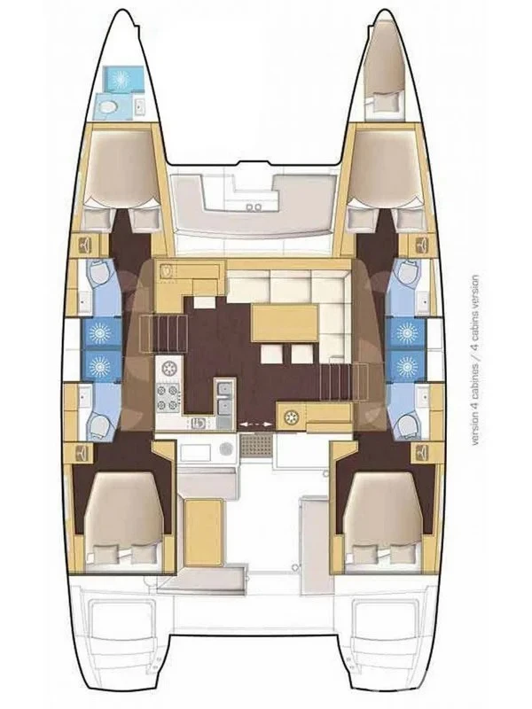 На Lagoon 46 Adrion есть все условия для комфортного отдыха: 5 гальюна, Горячая вода, Анемоментр/Ворона, Тиковый кокпит, Брашпиль, Плита с духовкой.